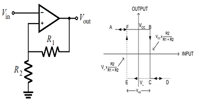 由于輸入是差分輸入,因此施密特觸發(fā)器具有較高的共模抑制比(CMRR)。盡管差分輸入提供了較高的CMRR,但輸入信號(hào)的自然變化仍可能導(dǎo)致兩個(gè)輸出狀態(tài)之間的意外切換。這應(yīng)該說(shuō)明可以將遲滯添加到比較器的原因。通過(guò)加寬磁滯窗口,上升沿和下降沿躍遷變得更加不同,并且電路可以承受更大的電壓波動(dòng),而無(wú)需意外切換。