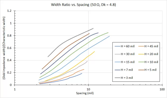 這個圖可能看起來很復(fù)雜,但它有一個簡單的解釋。每條曲線在 y 軸上與 1 相交的間距值將導(dǎo)致差分對中的走線寬度等于走線不是差分對的一部分時的走線寬度,同時仍提供相同的阻抗。換句話說,隔離的走線和成對的走線在每個電介質(zhì)厚度的特定間距值下將具有相同的寬度和50歐姆阻抗。